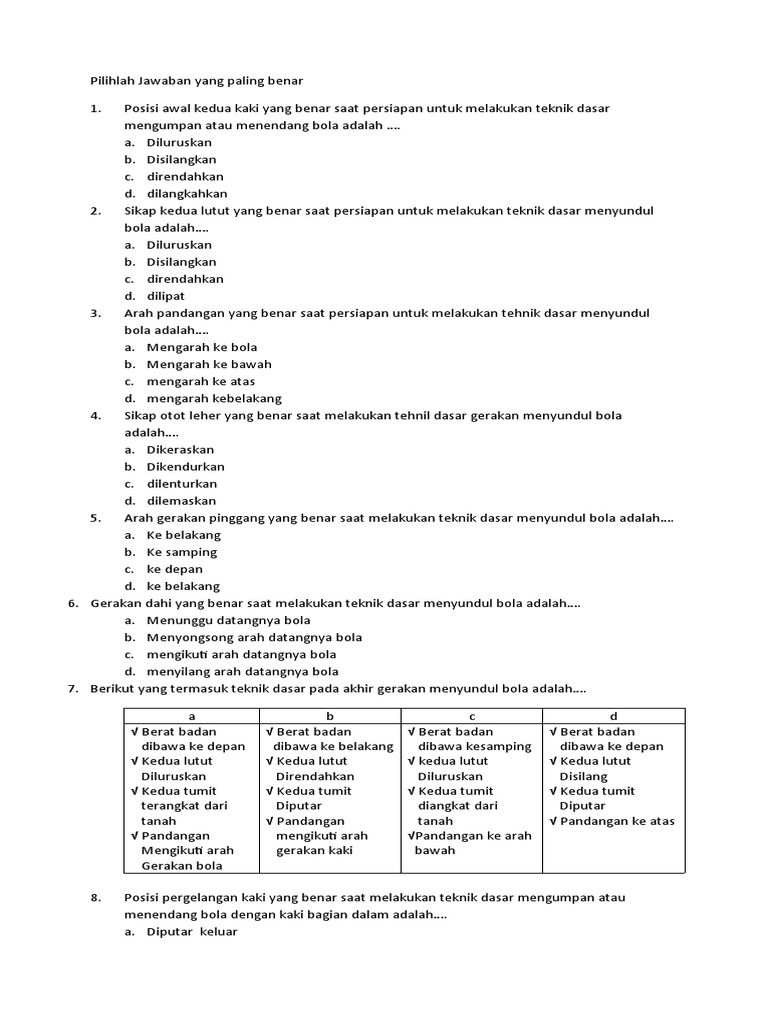 Sikap otot otot bagian leher yang benar melakukan teknik dasar gerakan menyundul bola adalah (a) dikeraskan. Permainan ini dimainkan oleh 11 orang pemain dalam satu tim. Jika pemain dalam keadaan berdiri maka: Karena dengan leher yang keras, maka akan membantu kecepatan dan kekuatan bagian kepala ketika melakukan sundulan ke arah bola. Cara menyundul bola atau heading yang benar adalah: